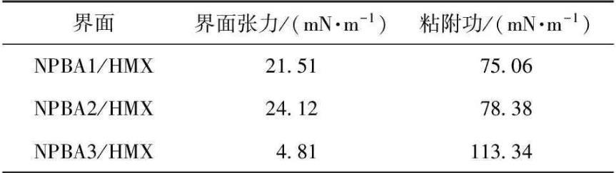 計算得到3種NPBA分別與HMX之間的粘附功WAB.界面張力和粘附功計算結果見表5.