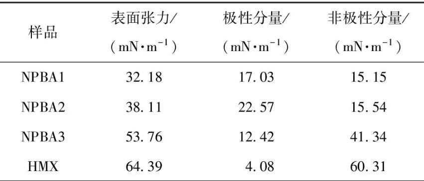 由表5可知,NPBA3與HMX的粘附功最大(113.34 mN/m),且界面張力最小(4.81 mN/m),表明3種NPBA中NPBA3與HMX的浸潤性(粘結性)最好,且外力破壞粘接界面需做的功(粘結強度)最大。與NPBA1相比,雖然NPBA2與HMX的粘附功相對較大(分別為75.06 mN/m和78.38 mN/m),但其界面張力相對也大(分別為21.51 mN/m和24.12 mN/m),表明NPBA2與HMX的粘結強度大于NPBA1,但浸潤性略弱。