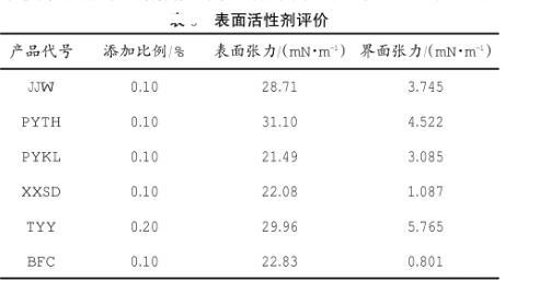 在減阻水中加入表面活性劑的主要目的是減小表面張力,降低返排壓裂液需要克服的地層喉道毛管力,從而促進壓裂液返排。對于致密頁巖氣藏,壓裂液的滯留會對儲層造成嚴重的水相圈閉損害,使得表面活性劑的作用更為重要。對表面活性劑6個樣品進行了性能評價,評價方法是利用K-100張力測量儀測定不同濃度表面活性劑溶液的表面張力,測定結果(見表2)。