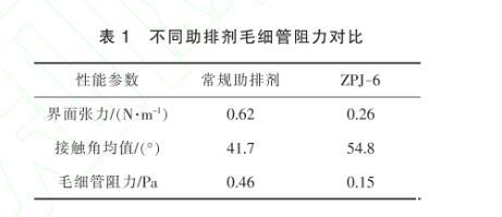毛細管力的作用使流體流動阻力增加,導致壓裂后壓裂液返排困難。如果地層壓力不能克服毛細管力,壓裂液濾液和殘渣吸附在裂縫表面,造成儲層孔隙堵塞和壓裂液無法返排,就會致使滲透率降低,傷害儲層。為了減少壓裂液在地層的停留時間,須使用助排劑,降低壓裂流體的表面張力。以降低油水相間界面張力、增大與巖心表面接觸角兩方面為目標,選取不同助排劑進行對比(見表1),優選出具有較佳界面張力與接觸角平衡值的新型助排劑ZPJ-6。與常規產品相比,新型助排劑具有較低的界面張力和較高的接觸角,毛細管阻力相對減小。