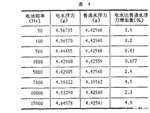 實驗用的振蕩穩(wěn)壓源是上海華東電子儀器廠制造的,輸出功率75W,該電源的電壓在實驗時保持300V、600V和700V三個數(shù)值。改變頻率從0到15kHz,水流過電場的速度為0.16m/s,水溫12.0±0.3℃,用長春市自來水和地下深井水。電水形成后20分鐘開始測浮力。測試時間為1984年10月18日到1984年10月21日,重復(fù)性實驗進(jìn)行六次,曲線都帶有極值。表4是在電壓600V下的一組數(shù)據(jù)。