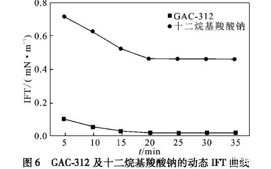 由圖6可知,羧酸鹽Gemini表面活性劑GAC-312在20 min內(nèi)可將油水界面張力降至7.6×10-3mN/m(超低界面張力級(jí)別),相同條件下,十二烷基羧酸鈉將界面張力僅降低至4.54×10-1mN/m,GAC-312界面活性優(yōu)異。GAC-312能夠具備優(yōu)秀的界面活性主要是由于羧基和水之間具有較強(qiáng)親和力,導(dǎo)致GAC-312可以更快、更好地吸附在界面上,其分子在油/水界面上的排列更緊密,降低油水界面張力的能力更強(qiáng)。