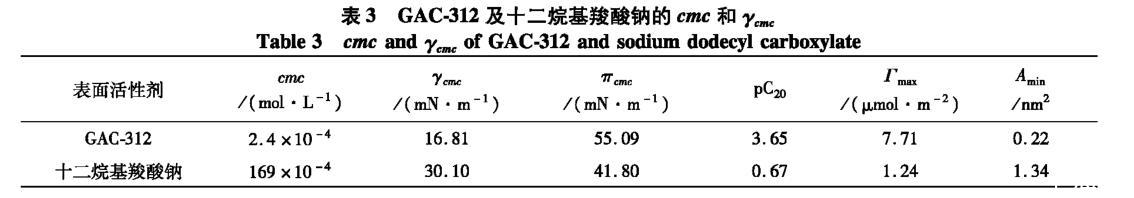 由圖5可知,隨著溶液濃度的增大,GAC-312及十二烷基羧酸鈉溶液的表面張力逐漸降低,當(dāng)濃度達(dá)到某點(diǎn)后,溶液的表面張力變化趨于穩(wěn)定,該點(diǎn)對(duì)應(yīng)的濃度即為GAC-312及十二烷基羧酸鈉的臨界膠束濃度(cmc)。GAC-312及十二烷基羧酸鈉的cmc及相關(guān)性能參數(shù)見表3。