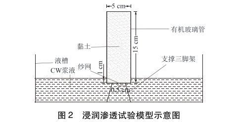 浸潤滲透試驗(yàn)?zāi)P腿鐖D2所示,主要由液槽、支撐三腳架和透明有機(jī)玻璃管組成。有機(jī)玻璃管直徑5cm,高15cm,頂端敞開,底部封閉鉆有直徑0.5cm的進(jìn)漿孔。試驗(yàn)時(shí)將黏土裝入有機(jī)玻璃管中,振搗壓實(shí),底部開孔處墊有紗網(wǎng),防止土體掉落。將有機(jī)玻璃管和支撐三腳架放入漿液槽內(nèi),有機(jī)玻璃管底部浸入漿液液面以下1.0cm,使?jié){液從底部滲入黏土中,通過觀察漿液在不同時(shí)間的滲透高度來評(píng)價(jià)漿液的浸潤滲透效果。