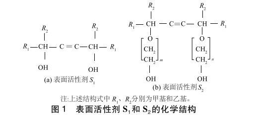 ?炔屬二醇表面活性劑(S1、S2),其臨界膠束濃度(CMC)為0.1%,化學(xué)結(jié)構(gòu)如圖1所示,美國氣體化學(xué)公司生產(chǎn);