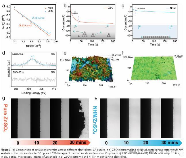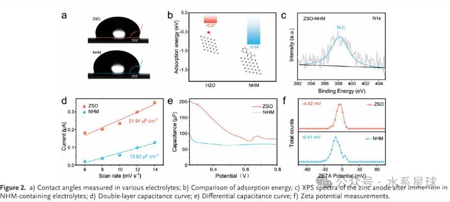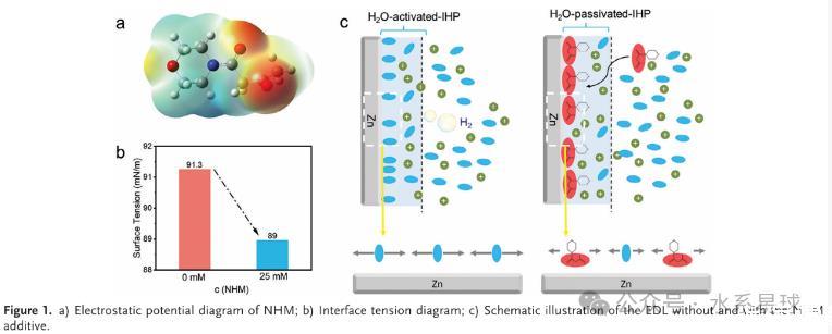 本研究探索了一種新型有機(jī)NHM添加劑,旨在增強(qiáng)陽(yáng)極界面穩(wěn)定性并改善鍍覆/剝離行為。通過(guò)降低界面張力,NHM添加劑重塑了電雙層(EDL),有效限制了鋅陽(yáng)極與H?O之間的接觸,從而抑制了寄生反應(yīng)。