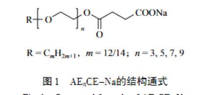 表面活性劑是一類應(yīng)用廣泛的有機化合物,極少的用量就能顯著提高溶液的性能,因此,表面活性劑的研究具有重要的現(xiàn)實和理論意義。其中,陰離子和非離子型表面活性劑的用量最多且應(yīng)用最為廣泛,它們具有優(yōu)異的去污性、水溶性、耐熱性、耐鹽性及制備成本低和環(huán)境友好等優(yōu)點。然而,傳統(tǒng)的表面活性劑分子通常只包含一個親水頭基和一個疏水尾鏈,很難同時具有陰離子和非離子表面活性劑的特性。值得一提的是,脂肪醇醚琥珀酸酯鹽(AEnCE-Na,n=3,5,7,9)是一種新型的表面活性劑,結(jié)構(gòu)通式如圖1所示。結(jié)構(gòu)決定性質(zhì),因此,可以推斷AEnCE-Na具有許多優(yōu)異的性能:1)一個分子中同時存在兩個親水基團(EO鏈和陰離子頭基)和一個疏水基團(烷基碳鏈),使其具有優(yōu)異的表面活性、乳化性和發(fā)泡性;2)分子中的酯基在水解后可形成具有優(yōu)異生物降解性的非離子表面活性劑和鹽,因此,該類表面活性劑安全且環(huán)保,符合當(dāng)代“綠色化”的發(fā)展理念;3)直鏈表面活性劑比支鏈表面活性劑具有更好的自降解能力。然而,目前對于脂肪醇醚琥珀酸酯鹽表面活性劑的研究甚少。
