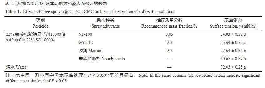 當(dāng)溶液中的表面活性物質(zhì)的質(zhì)量濃度達(dá)到其CMC時(shí),液體具有良好的吸附和潤濕性,因此確定助劑的最低施用濃度以大于等于其CMC為依據(jù)。3種噴霧助劑的CMC測定結(jié)果見圖1。NF-100、GY-T12和邁潤3種噴霧助劑的CMC的對數(shù)值分別為2.40、3.43和3.46,得到其CMC分別為250、2708和2877 mg/L,其中糖基類表面活性劑NF-100具有更低的CMC,比另外兩種低一個(gè)數(shù)量級。根據(jù)助劑添加量應(yīng)適當(dāng)大于其CMC的原則,考慮量取方便,將NF-100的添加量確定為500 mg/L、折算為質(zhì)量分?jǐn)?shù)0.05%,將GY-T12和邁潤的添加量確定為3000 mg/L、折算為質(zhì)量分?jǐn)?shù)0.3%。在此添加量下,測定了3種噴霧助劑對氟啶蟲胺腈藥液表面張力的影響。結(jié)果(表1)表明,添加NF-100、GY-T12和邁潤3種助劑后,氟啶蟲胺腈藥液的表面張力顯著降低,由未添加助劑時(shí)的50.65 mN/m分別降低至34.03、35.64和27.64 mN/m,其中邁潤對藥液表面張力的降低效果最顯著,3種助劑之間均存在顯著差異(P<0.05)。