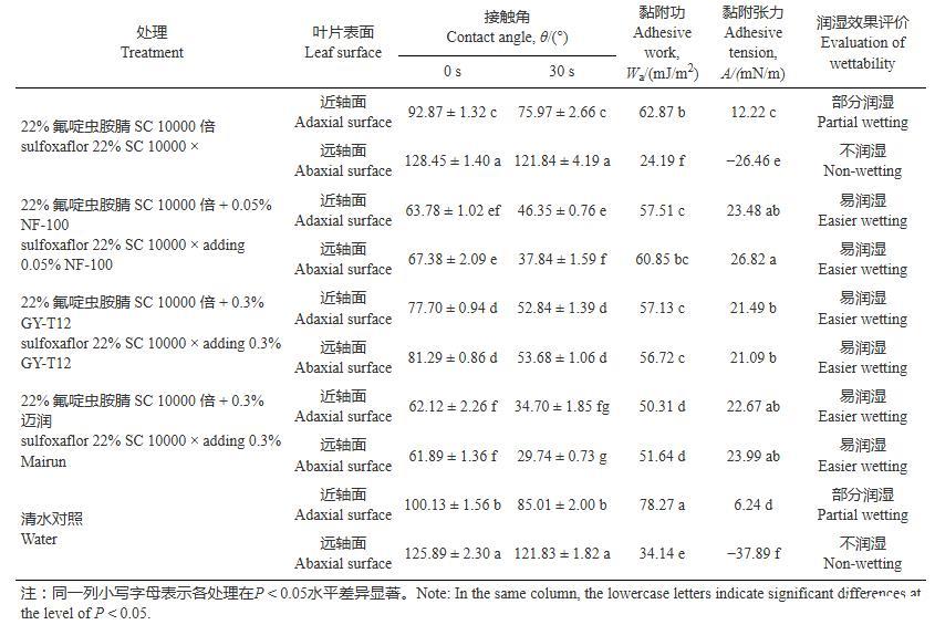 表2氟啶蟲胺腈添加助劑在蘋果葉片表面接觸角、黏附功及黏附張力的變化