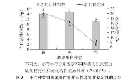 圖3不同種類肉肌漿蛋白乳化活性及乳化穩(wěn)定性的差異