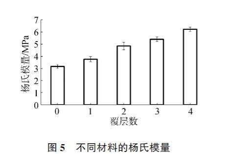 對羥基磷灰石和覆層材料的楊氏模量進行了測量,結果如圖5所示。空白的羥基磷灰石材料的楊氏模量為3.14±0.16 MPa,隨著覆層層數的增加楊氏模量逐漸增加,最高可達6.21±0.18 MPa,說明膠原蛋白肽的覆層能夠有效地改善羥基磷灰石材料的力學性能,提高其楊氏模量。