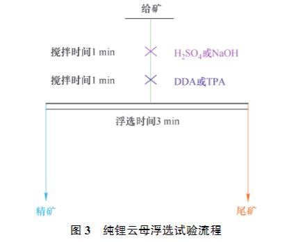 在XFG掛槽浮選機上進行純礦物浮選試驗,轉速設為1 992 r/min。每次稱取2.00 g純礦物放入50 mL浮選槽中,然后加入40 mL超純水,用H?SO?或NaOH調節pH值,攪拌礦漿1 min,加入一定量DDA或TPA,攪拌1 min,保持充氣量恒定,充氣1 min,用刮板刮出泡沫產品,每間隔3 s刮1次,浮選刮泡時間為3 min。結束后將得到的泡沫產品(精礦)和槽內產品(尾礦)分別烘干、稱量、計算回收率。進行浮選pH及濃度試驗時,每組試驗設置1個平行試驗,并對浮選結果求平均值。純礦物浮選試驗流程如圖3所示。