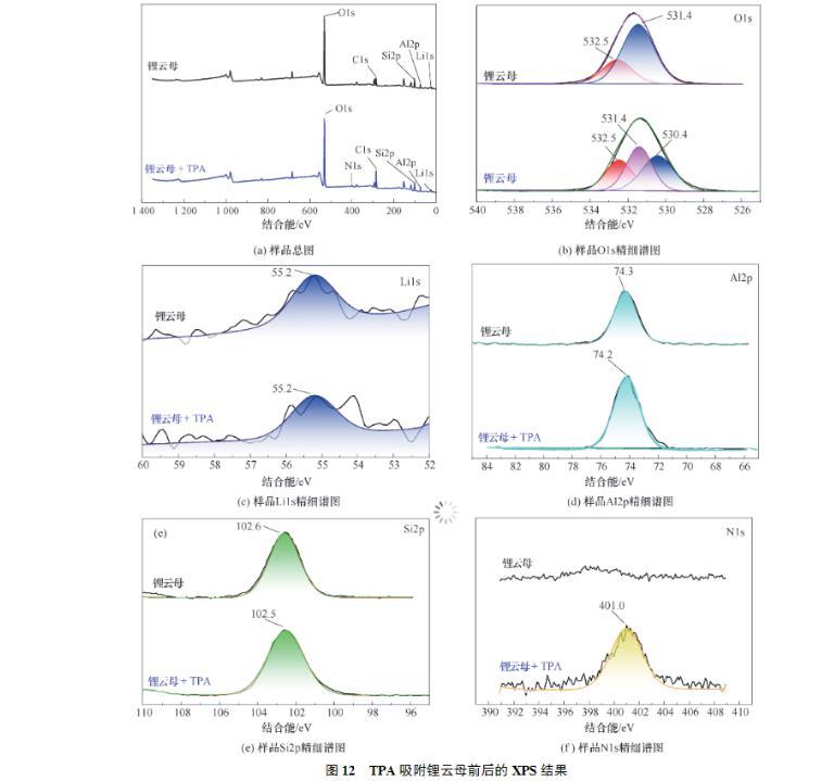 (2)接觸角試驗表明,同等條件下,TPA作用鋰云母的接觸角總是大于DDA,展現了TPA更強的疏水性。Zeta電位測試結果表明,TPA及DDA在鋰云母表面的吸附為靜電吸附,并且碳鏈更長的TPA由于疏水效應吸附性更好,進一步證明了TPA的強疏水性。FTIR及XPS進一步證實了TPA吸附在鋰云母表面。