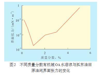 由水溶性好且不易揮發(fā)的有機(jī)堿OA水溶液在不同質(zhì)量分?jǐn)?shù)時(shí)與孤東油田原油之間界面張力的關(guān)系可以看出,當(dāng)有機(jī)堿OA水溶液質(zhì)量分?jǐn)?shù)為0.1%~1.0%時(shí),界面張力隨有機(jī)堿OA水溶液質(zhì)量分?jǐn)?shù)的增加迅速下降,當(dāng)有機(jī)堿OA質(zhì)量分?jǐn)?shù)超過(guò)1.0%后,界面張力逐漸升高。表明有機(jī)堿OA水溶液與孤東油田原油作用可降低界面張力,且最佳的有機(jī)堿OA水溶液質(zhì)量分?jǐn)?shù)為1.0%。