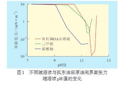 由不同pH值的碳酸鈉、三甲胺、有機(jī)堿OA水溶液與孤東油田原油之間界面張力的關(guān)系可見(jiàn),無(wú)機(jī)堿和有機(jī)堿均可使孤東油田原油界面張力降低。當(dāng)碳酸鈉溶液的pH值高于9時(shí),其與原油的界面張力隨著pH值的升高而降低;當(dāng)碳酸鈉溶液的pH值大于11時(shí),其與原油的界面張力幾乎不再變化;當(dāng)三甲胺和有機(jī)堿OA水溶液的pH值分別達(dá)到10和10.5后,其與原油的界面張力隨pH值升高先降低后升高,這是有機(jī)堿不同于無(wú)機(jī)堿的特點(diǎn)。