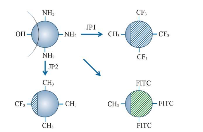 將具有APS和OTS的SiO?顆粒分散在2.4×10?2 mol/L PFOA的甲苯溶液中并攪拌48 h。通過蒸發除去溶劑,再多次離心洗滌,然后在110℃下退火2 h,將所制得的顆粒命名為JP1,制備過程如Scheme 1所示。