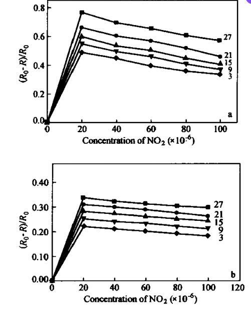 LB膜越薄,與氣體的接觸越充分,被氧化的程度也越高,因而對氣體的響應也就越快。同層的PAN/NMP LB膜較PAN-AA/NMP LB膜具有更快的響應。3層聚苯胺LB膜對相對百分比為20×10??NO?的響應時間為10 s,但是當層數增加到27層時,響應時間就上升到90 s。而對于27層的聚苯胺與乙酸的混合LB膜,響應時間就更長,接近3 min。另一方面,響應時間還隨NO?氣體濃度的增加而增長。圖5反映了15層聚苯胺LB膜的響應時間與氣體濃度變化之間的關系。在相同氣體濃度下,PAN/NMP LB膜較PAN-AA/NMP LB膜具有更快的響應和更好的靈敏度。PAN/NMP LB膜對相對百分比為20×10??NO?的響應時間為30 s,而PAN-AA/NMP LB膜則為50 s。當氣體濃度增大到相對百分比為100×10??時,響應時間分別變化到150 s和180 s。