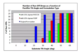 原始配方中超過一半以上的液滴在20°的傾斜角滾落,40°時,全部液滴滾落。Agrosurf NEC38比Agrosurf SSP更有效,可防止所有液滴在30°時滾落,避免60%的液滴在40°滾落。客戶可根據(jù)這種方法,尋找更加優(yōu)異的表面活性劑。