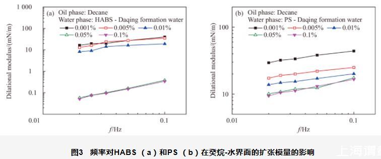 圖3頻率對HABS(a)和PS(b)在癸烷-水界面的擴張模量的影響