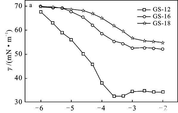2.2.1 Krafft溫度Krafft溫度影響表面活性劑溶解度,表面活性劑在此溫度以上可以形成膠束。在Krafft溫度以下,以單分散的表面活性劑與水化固體表面活性劑的狀態存在,而在Krafft溫度以上,水化固體表面活性劑的溶解和膠束形成也參與了平衡[9-10]。質量分數1%表面活性劑GS-12,在室溫可以完全溶解,將其溶液置于冰水混合物中1周,溶液仍然澄清透明,沒有渾濁的跡象。表明GS-12的Krafft溫度低于0℃。通過測量電導率可以得到Krafft溫度的近似值,由圖3可知,GS-16,GS-18的Krafft溫度分別為27,27.5℃。k值在較低溫度下緩慢增加,這是由于離子表面活性劑的溶解度有限。隨著溫度的進一步升高,Krafft溫度處的k值急劇增加。k值的增加是由于膠束的形成,水合表面活性劑的溶解度突然增加,直至達到克拉夫特溫度。此外,離子遷移率增加隨著溫度增加、k逐漸增加[3,10]。結果表明,Gemini表面活性劑的Krafft溫度隨表面活性劑的疏水鏈長的增加而升高。