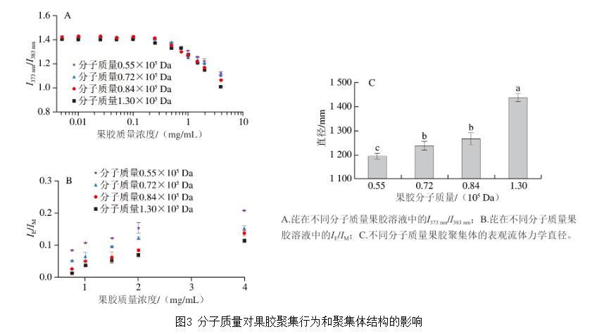 為研究分子質(zhì)量對果膠聚集行為的影響,本實(shí)驗(yàn)分析了芘在不同分子質(zhì)量果膠溶液中的I373 nm/I383 nm。如圖3A所示,在4種不同分子質(zhì)量的果膠溶液中,芘的I373 nm/I383 nm均在果膠質(zhì)量濃度達(dá)到特定值后開始降低,表明這些果膠均可在溶液中組裝形成包含疏水微區(qū)的聚集體。分子質(zhì)量為0.55×105、0.72×105、0.84×105 Da和1.30×105 Da果膠的臨界聚集質(zhì)量濃度分別為0.52、0.50、0.45 mg/mL和0.36 mg/mL。此外,在高于臨界聚集濃度的條件下,高分子質(zhì)量果膠呈現(xiàn)出更低的I373 nm/I383 nm。這些結(jié)果表明高分子質(zhì)量果膠更易發(fā)生聚集,且形成的聚集體內(nèi)部疏水微區(qū)的極性更低。