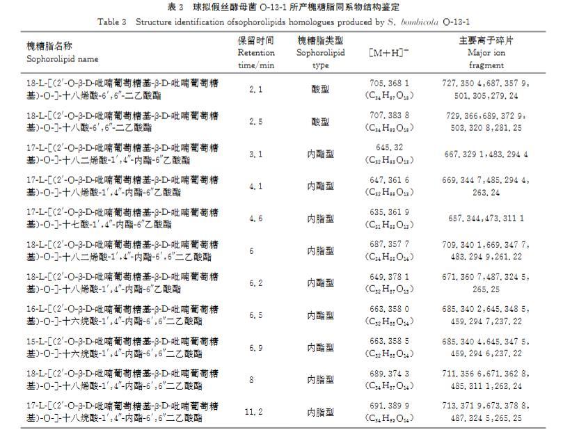 表3球擬假絲酵母菌O-13-1所產槐糖脂同系物結構鑒定
