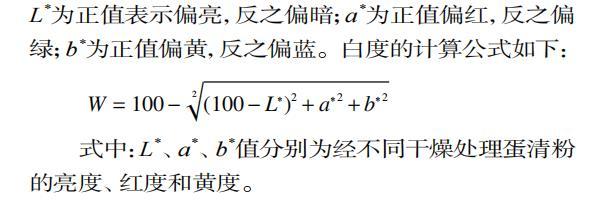 式中:L*、a*、b*值分別為經不同干燥處理蛋清粉的亮度、紅度和黃度。