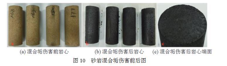 為在室內模擬混合垢巖心傷害,設計如下實驗步驟:①氣測巖心初始滲透率;②模擬無機垢傷害:使用10.5%碳酸鈉溶液與15%氯化鈣溶液交替注入,模擬無機垢(CaCO3)的損害;③模擬有機垢傷害:50%的瀝青正庚烷溶液與二甲苯1∶1混合,抽真空進行巖心飽和,傷害72 h后烘干;④傷害后巖心氣測滲透率;⑤計算傷害率。混合垢傷害前后砂巖巖心圖片見圖10。
