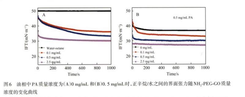 圖6油相中PA質(zhì)量濃度為(A)0 mg/mL和(B)0.5 mg/mL時(shí),正辛烷/水之間的界面張力隨NH2-PEG-GO質(zhì)量濃度的變化曲線