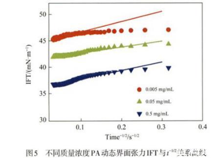 用同樣的方法,根據(jù)圖5中不同質(zhì)量濃度PA動(dòng)態(tài)界面張力隨時(shí)間t-1/2變化,計(jì)算了PA向界面運(yùn)動(dòng)的擴(kuò)散系數(shù)DPA,計(jì)算得到的DPA~1×10-10 m2/s,與表1中估算得到的PA擴(kuò)散系數(shù)為同一數(shù)量級(jí),這表明在低質(zhì)量濃度條件下,PA向界面吸附運(yùn)動(dòng)為擴(kuò)散控制過(guò)程,這與之前文獻(xiàn)中報(bào)道的現(xiàn)象相一致。本節(jié)進(jìn)行的單組分吸附動(dòng)力學(xué)解析將為下面的多(雙)組分共吸附動(dòng)力學(xué)提供基準(zhǔn)和校準(zhǔn)。