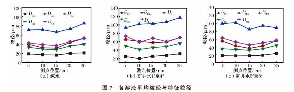礦井水1#至8#在15cm處的平均粒徑和特征粒徑逐漸增大,這說明表面張力對噴霧平均粒徑和特征粒徑具有直接影響。礦井水1至4#各平均粒徑和特征粒徑之間差異明顯,而其余溶液差異較小,這表明純水和礦井水5#至8#的噴霧粒徑分布優于礦井水1至4,霧場中霧滴更趨向均一化分布,易于捕集沉降粉塵。綜上,礦井水中Na+、K+離子濃度對其表面張力及噴霧液滴粒徑變化趨勢至關重要,對于霧場中噴霧粒徑的均一性和各平均粒徑和特征粒徑的差異性也有重要影響。