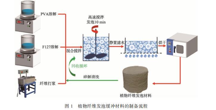 將375 g木纖維漿板泡入23 L去離子水中12 h,使用瓦力打漿機細化30 min,得到打漿度(°SR)為20的闊葉木纖維。將纖維與PVA、F127按不同比例混合,加入去離子水形成懸浮液。將懸浮液在5000 r/min下高速分散10 min,隨后倒入帶有100目篩網的模具中排水12 h,脫模后在100℃干燥12 h,獲得植物纖維發泡材料。