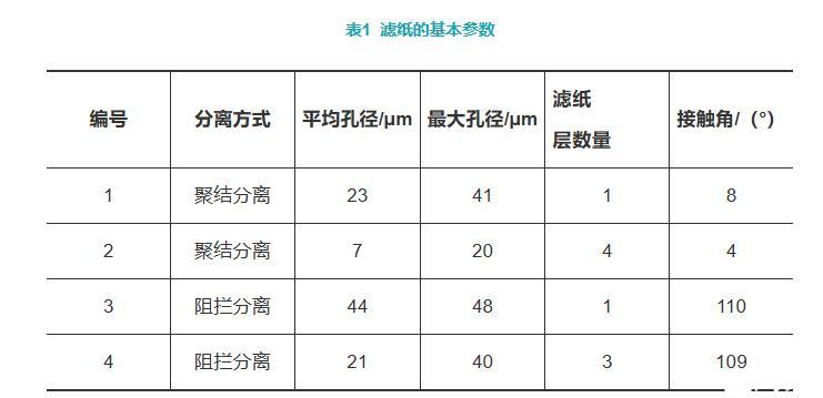 聚結(jié)式濾紙分離水的主要步驟為:(1)從不混溶的液體中傳輸小水滴到過濾器;(2)小水滴附著在纖維表面;(3)因聚結(jié)使附著在纖維上水滴的尺寸增加;(4)水滴在纖維上的合并和傳輸;(5)水滴因為重力脫離濾紙表面落到集水槽內(nèi)。阻攔式濾紙分離水的原理是利用疏水纖維的疏水性,把水顆粒阻攔在濾紙表面,通過黏性聚結(jié)生長成的大水滴在重力的作用下脫離濾紙表面。
