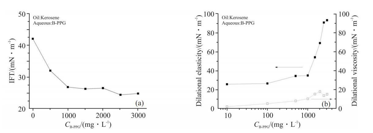 B-PPG是部分支化、部分交聯(lián)的聚丙烯酰胺,其分子結(jié)構(gòu)中既含有親水基團(tuán)丙烯酰胺,又含有疏水的烷基鏈,是一種高分子量的界面活性物質(zhì),能夠在油水界面上自發(fā)地吸附成膜,降低界面張力。Fig.2為B-PPG濃度對(duì)煤油-水界面張力和界面擴(kuò)張流變參數(shù)的影響。由Fig.2(a)可知,B-PPG溶液具有一定的界面活性,隨著其濃度增大,界面張力逐漸降低,濃度高于1000mg/L后,達(dá)到平臺(tái)值,約為25為mN/m。由Fig.2(b)可以看出,濃度低于1000mg/L時(shí),B-PPG形成的界面膜強(qiáng)度較低,擴(kuò)張彈性和擴(kuò)張黏性隨濃度緩慢增大。擴(kuò)張彈性從約25mN/m升高到35mN/m,擴(kuò)張黏性從約1mN/m升高到10mN/m;當(dāng)B-PPG濃度大于1000mg/L時(shí),隨著濃度的增大,界面膜的擴(kuò)張彈性顯著升高,濃度達(dá)到2000mg/L時(shí),擴(kuò)張彈性高達(dá)90mN/m;而擴(kuò)張黏性變化不大,僅上升到約20mN/m。