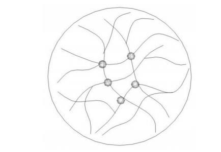 聚合物驅(qū)是油田開(kāi)發(fā)穩(wěn)產(chǎn)增產(chǎn)最重要的技術(shù)手段之一,在國(guó)內(nèi)外油田得到了廣泛的應(yīng)用。但聚驅(qū)后油藏儲(chǔ)層非均質(zhì)性加劇,剩余油分布更加分散,常規(guī)方法已經(jīng)無(wú)法滿足生產(chǎn)實(shí)踐的需要。近年來(lái),改性聚丙烯酰胺已成為研究熱點(diǎn),其中黏彈性顆粒驅(qū)油劑(B-PPG)由于其獨(dú)特的性能更是得以快速發(fā)展。B-PPG是通過(guò)多官能團(tuán)引發(fā)合成的高分子支化鏈與三維交聯(lián)網(wǎng)絡(luò)結(jié)構(gòu)共存的聚丙烯酰胺,其分子結(jié)構(gòu)示意圖如Fig.1所示。這種“軟固體”凝膠顆粒以固體顆粒的形式懸浮于溶液中,具有較好的變形能力,運(yùn)移過(guò)程中時(shí)堵時(shí)驅(qū),可以有效調(diào)節(jié)地層的非均質(zhì)性。同時(shí),其又具有較好的耐溫抗鹽、耐老化能力。目前,B-PPG驅(qū)油劑已經(jīng)在勝利油田、河南油田推廣應(yīng)用,增油降水效果明顯。
