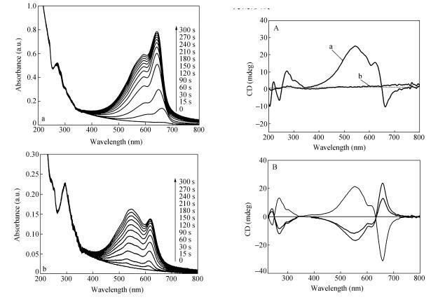 以CODA為例,隨著紫外光輻照時間增加,LB膜在590和640nm處出現2個典型的聚二乙炔藍相吸收峰,且隨時間增加而逐漸增強,薄膜顏色由淡黃色變為藍色。而對于CO2DA LB膜,隨著254nm紫外光輻照時間的增加,在540和620nm處出現兩個明顯的吸收峰,分別對應于聚二乙炔紅相和藍相的典型吸收,薄膜顏色由淡黃色變為紫色。隨著輻照時間的增加,540nm處吸收峰明顯增強,聚合薄膜中聚二乙炔紅相組分變多。