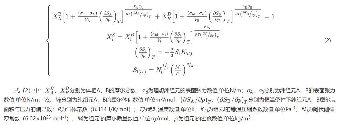式(2)中:分別為體相A、B的摩爾分數;σid為理想純組元的表面張力數值,單位N/m;σA、σB分別為純組元A、B的表面張力數值,單位N/m;VA、VB分別為純組元A、B的摩爾體積數值,單位m3/mol;