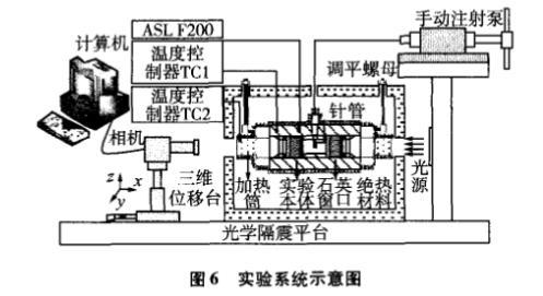 實(shí)驗(yàn)本體材料為316不銹鋼,設(shè)計(jì)承壓范圍為0—20MPa,兩端設(shè)計(jì)有法蘭結(jié)構(gòu)的觀察窗。懸滴通過不銹鋼針頭形成,其端口平整,外徑規(guī)格為(1.61±0.005)mm,內(nèi)徑為0.3mm,通過螺紋結(jié)構(gòu)緊固于本體內(nèi)。采用LED白色冷光源和1400萬像素的CMOS相機(jī)及其放大鏡頭采集懸滴圖像。實(shí)驗(yàn)本體溫度采用電加熱分段控制,在其非觀察面上均勻纏繞電加熱絲并利用Fluke2100溫度控制器控制其溫度,在觀察窗兩側(cè)安裝有加熱筒,并控制加熱筒的溫度高于本體溫度約5—10℃,防止在升溫的過程中窗口結(jié)霧。實(shí)驗(yàn)系統(tǒng)的溫度范圍為20—180℃,溫度波動(dòng)度好于±10mK。本體溫度采用ASL F200高精度溫度測量儀測量,校準(zhǔn)證書顯示的全量程測溫不確定度為±10mK,Pt100溫度計(jì)由北京計(jì)量院標(biāo)定,標(biāo)定證書顯示的不確定度為±5mK。因此,本文實(shí)驗(yàn)系統(tǒng)的溫度擴(kuò)展不確定度為±30mK(k=2)。實(shí)驗(yàn)本體通過螺紋桿懸至于環(huán)氧樹脂保溫箱體內(nèi)部,并利用調(diào)平螺母調(diào)節(jié)本體的高度和水平,從而使其內(nèi)部的針管處于鉛垂位置并在相機(jī)視野的中心。待本體溫度穩(wěn)定30min后,開始采集懸滴圖像,每滴采集10次,間隔為3s,至少采集3個(gè)懸滴共計(jì)30張圖片,擬合計(jì)算并取平均值作為最后的實(shí)驗(yàn)結(jié)果。