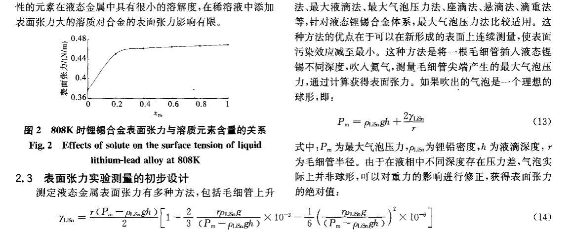 核能是公認現實可行的、可大規模替代常規能源的清潔能源。聚變堆或聚變_裂變混合堆液態金屬包層因其固有特性和優勢,在國際上被普遍認為是未來電站最具發展潛力的包層設計方案之一。作為包層氚增殖劑和冷卻劑的鋰錫合金與鋰鉛合金一樣,具有廣闊的發展前景,其制備、純化、質量輸運等工藝難題正逐步得到重視。液態金屬的表面張力不僅是認識和理解冶煉過程最基本的物理量之一,而且是氣體吸收、氣泡形核、雜質生長等界面現象的控制因素。目前對液態金屬表面張力的研究多集中于金屬單質,合金的表面或界面行為在理論或實驗上都相當不足,主要是由于精確確定表面張力十分困難[2]。針對液態鋰錫合金這種新型的核材料,從基礎研究方面看,目前還沒有一種實驗方法能確定液體界面的結構,即兩個相之間過渡區域的結構,因此需要有一些假設或模型來滿足表面張力理論的研究。