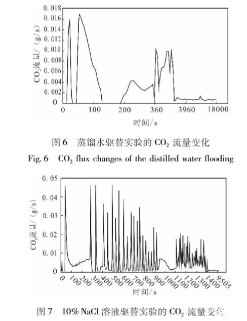 由CO2流量曲線可以發現,以驅替液突破巖心為分界點,也可以將CO2流量隨時間變化劃分為兩個階段:驅替液突破巖心前,CO2流量隨時間都發生較大的波動(活塞式驅替階段);驅替液突破巖心后,CO2氣體流量迅速減少,并且最終趨于一個穩定值,CO2流量曲線幾乎不再波動帶式驅替階段)。因為活塞式驅替階段中驅替出的CO2速率是劇烈變化的,所以CO2流量隨時間發生了較大的波動。這一穩定值的出現,是因為實驗開始一段時間后,巖心中可被驅替的超臨界CO2已被完全驅替,巖心中只剩下被毛細力所束縛的CO2。驅替液流出后,由于溫度和壓力的降低,本來溶解在驅替液中的CO2散逸出來,而驅替液初始溶解的CO2量是一定的,散逸出的CO2也是一定的,所以CO2氣體流量最終趨于穩定。對比圖6一圖9發現,10%NaCl和10%CaCl2溶液驅替實驗的CO2流量曲線隨時間波動最為劇烈,混合溶液次之,波動最小的是蒸餾水驅替實液驗的CO2流量曲線。