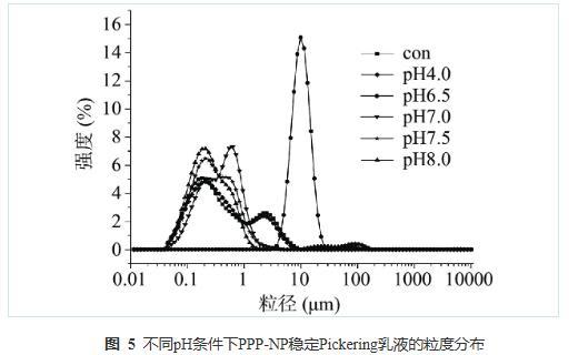 乳液在不同pH下的粒徑分布如圖5所示。大多數(shù)乳液呈現(xiàn)雙峰分布,但峰均不同。這可能是由于PPP-NP在油水界面上的重組和重排可能使液滴橋接,從而導(dǎo)致其呈雙峰分布。con與pH4.0的乳液的粒徑分布在較寬的范圍內(nèi)變化,而在中性及堿性條件下(pH7.0~8.0),乳液的液滴尺寸分布在小范圍內(nèi)相對(duì)均勻。乳液液滴粒徑分布范圍越窄、峰值越小表明乳液越穩(wěn)定;因此,堿性條件下制備的Pickering乳液相對(duì)穩(wěn)定。事實(shí)上,較多種類的蛋白質(zhì)在堿性條件下的熱變性和適度聚集均會(huì)導(dǎo)致其乳化性增強(qiáng),包括乳清分離蛋白、卵白蛋白等。而且,雖然pH6.5乳液的粒徑分布比較窄,但其峰值遠(yuǎn)遠(yuǎn)大于其余各組,與較大的液滴尺寸相對(duì)應(yīng)的乳液的峰面積可能是由于橋接機(jī)制形成的絮凝。因此可能導(dǎo)致pH6.5乳液的長期穩(wěn)定性低于堿性條件下制備的Pickering乳液。
