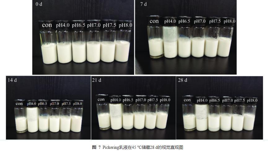 制備了不同pH下PPP-NP穩(wěn)定的水包油Pickering乳液,并在45℃下加速儲(chǔ)存28 d,每7 d進(jìn)行拍照記錄其視覺外觀的變化。乳液的視覺外觀監(jiān)測照片如圖7所示。con和pH4.0的乳液在加速儲(chǔ)藏7 d后發(fā)生分層和聚結(jié)等現(xiàn)象;pH6.5的乳液在第14 d時(shí)底部出現(xiàn)分層現(xiàn)象;pH7.0~8.0的乳液在儲(chǔ)藏28 d后仍保持良好的視覺外觀,未出現(xiàn)相分離、聚結(jié)等現(xiàn)象,在整個(gè)實(shí)驗(yàn)過程中均保持均勻穩(wěn)定。這些現(xiàn)象直觀地表明PPP-NP具有良好的乳化能力,且制備出的乳液具有較好的穩(wěn)定性,這可能與蛋白聚集體表面疏水性提高,從而有效降低其在油水界面上吸附所需的能量。