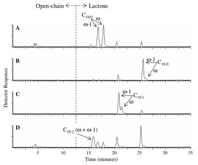 在4個(gè)SL中,只有一個(gè)SL-p的x-連桿總數(shù)大于x-1-連桿。 具體而言,在75%的棕櫚酸殘基中,39%通過(guò)x位置連接,36%通過(guò)x-1位置連接。 在其他情況下,大部分(至少71%)的脂肪酸通過(guò)x-1位置結(jié)合(亞油酸在所用LC方法下不可溶解,因此被報(bào)告為x和x-1組合結(jié)構(gòu))。 這些結(jié)果表明,為了形成內(nèi)酯,糖苷鍵和酯鍵之間必須至少有15個(gè)甚至17個(gè)碳單元。 SL-o和SL-s中對(duì)x-1連接的極大偏好表明17個(gè)碳是內(nèi)酯形成的首選碳。 然而,通過(guò)將棕櫚酸連接到x碳處的SL,鏈長(zhǎng)度增加了1個(gè)碳單元(鍵間16個(gè)碳),使得內(nèi)酯的形成比連接到x-1碳(鍵間15個(gè)碳)時(shí)更有利。 SL-p中存在C17:0脂肪酸含量較低(3%)的SLs進(jìn)一步證實(shí)了這一點(diǎn),而SL-s、SL-o和SL-l中沒(méi)有C17:0脂肪酸夾雜的跡象。 根據(jù)這些數(shù)據(jù)和二乙酰化內(nèi)酯分布(見(jiàn)表2),得出結(jié)論,對(duì)于SL包裹體測(cè)試的單個(gè)脂肪酸,其優(yōu)先順序?yàn)橛退帷⒂仓帷⒆貦八岷蛠営退幔约癈18脂肪酸, 單原子飽和優(yōu)于飽和和雙不飽和。
