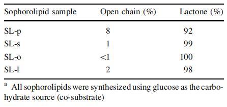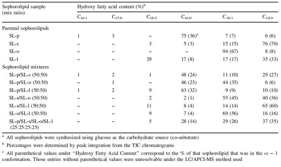 表1:通過(guò)LC/APCI MSa測(cè)定的由C.bombicola從棕櫚酸(SL-p)、硬脂酸(SL-s)、油酸(SL-o)、亞油酸(SL-l)酸生產(chǎn)的槐脂的結(jié)構(gòu)含量(開(kāi)鏈與內(nèi)酯)