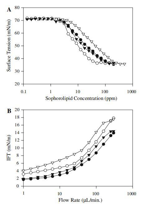 槐脂(SLs)相對(duì)較大的生產(chǎn)能力、可再生性和“生態(tài)友好性”有助于提高其作為家庭和個(gè)人護(hù)理產(chǎn)品中某些石化表面活性劑的添加劑或替代品的工業(yè)意義。 然而,為了考慮用于工業(yè)用途,SLs也必須廉價(jià)生產(chǎn),并且必須了解和控制其物理性質(zhì),以便準(zhǔn)確預(yù)測(cè)SLs在各種應(yīng)用中的潛力。 表面張力(ST)、臨界膠束濃度(CMC)、界面張力(IFT)和水溶性是表面活性劑應(yīng)用特別關(guān)注的四個(gè)性質(zhì)。 理想情況下,良好的表面活性劑是水溶性的,表現(xiàn)出較低的CMC,并導(dǎo)致最小表面張力(min.ST)小于30 mN/m。 這些性質(zhì)中的每一種都可以根據(jù)表面活性劑的化學(xué)組成進(jìn)行控制。 通過(guò)在多種不同的混合基質(zhì)(包括葡萄糖和4種不同的脂肪酸)上生長(zhǎng)棉鈴蟲,我們產(chǎn)生了具有不同化學(xué)分布的SLs。 簡(jiǎn)單地通過(guò)改變脂肪酸來(lái)生產(chǎn)不同的SLs的能力提供了在發(fā)酵水平上管理物理性質(zhì)的前景,并通過(guò)在應(yīng)用水平上以不同的比例混合SLs。