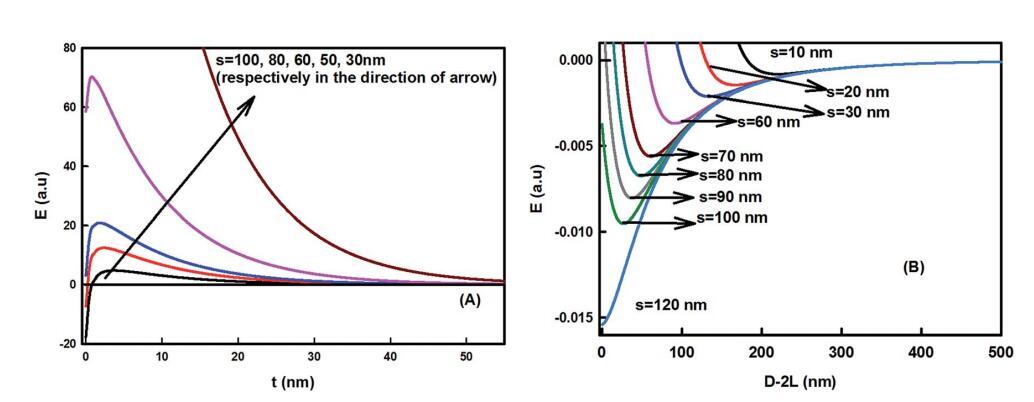 圖6足跡直徑對粘粒組件的影響。(A) 作為界面區域厚度函數的能量變化(L?60 nm,T?298 K,f?0.5,姜黃素納米顆粒半徑R?50 nm,疏水衰減長度x0?1 nm,界面張力?40 mN m-1)。(B) 粘粒–粘粒相互作用作為粒間分離D的函數,使用方程(5)計算。對于更大的封裝外形直徑,能量最小值變得更深,對于大于100 nm的s,能量最小值變得更有吸引力。