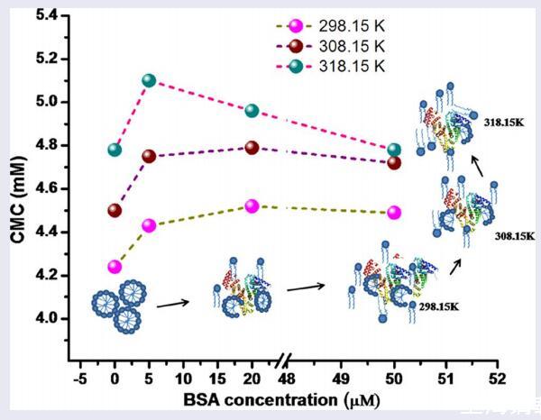 用表面張力法研究了牛血清白蛋白對IL型gemini表面活性劑[C10-4-C10im]Br2表面性質(zhì)的影響。研究了不同溫度下臨界膠束濃度(CMC)與BSA濃度的關(guān)系。[C10-4-C10im]Br2的CMC隨著BSA濃度的增加以及系統(tǒng)溫度的升高而增加。界面參數(shù),即;計(jì)算了最大表面過量濃度(Γmax)、每分子最小面積(Amin)和CMC下的表面壓力(ΔCMC)。此外,利用表面張力數(shù)據(jù)評估了吸附和膠束化的熱力學(xué)參數(shù)。結(jié)果表明,[C10-4-C10im]Br2與BSA的結(jié)合是自發(fā)的、放熱的。該過程是熵驅(qū)動的,疏水相互作用是主要驅(qū)動力。