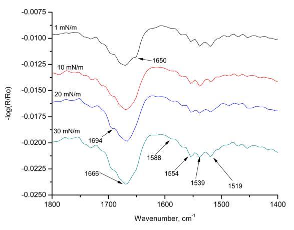 圖9顯示了在不同表面壓力下獲得的HI-Langmuir單層膜的s偏振輻照度。 在1 mN m的表面壓力下 ? 1,在1650 cm處存在一條帶 ? 1對應于α-螺旋。 隨著表面壓力的增加,該條帶消失,并在1666 cm處并入該條帶 ? 1. 這條帶子長1666厘米 ? 1包括β-轉角和α-螺旋。 這條帶子有1694厘米長 ? 1對應于β片。 這條帶子在1519厘米處 ? 1也對應于α-螺旋。 在入射角為60°的情況下,在1670處觀察到的能帶可歸屬于存在于β-轉角中的空間約束C=O部分,或者由于β-薄片中的躍遷偶極耦合而注意到峰值中的分裂。 當改變表面壓力時,最強烈的譜帶出現(xiàn)在1554和1539厘米處 ? 1,兩條帶均對應于酰胺II區(qū)的α-螺旋。 所有三條主譜帶都表明HI-Langmuir單層的s極化輻照度中存在α-螺旋。