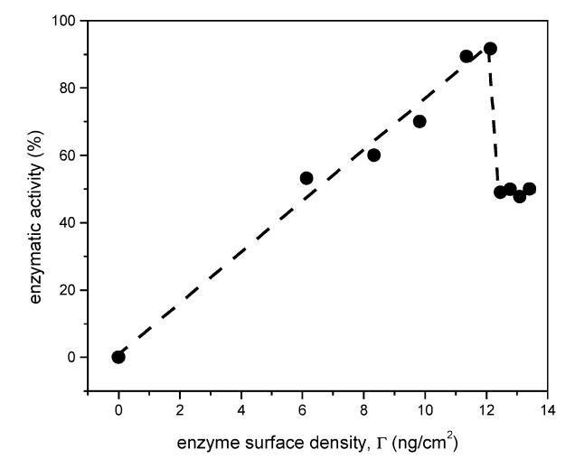圖2.估計酶表面密度的影響(Γ)關于PNPPA酶活性。酶活性表示為在均勻介質中測得的酶活性的百分比。最大值對應于12.1 ng/cm2的酶表面密度。0-12 ng/cm2的范圍對應于0-18 mN/m的表面壓力;但是,觀察到,在圖中所示的最高表面密度中,曲線不是t線性。圖3更好地分析了對表面壓力的依賴性。