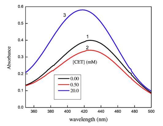 圖7.含有不同體積百分比二甘醇-水混合物(1)5 v/v%二甘醇-水(2)10 v/v%二甘醇-水和(3)15 v/v%二甘醇-水的CET/[C10min][Cl]膠束聚集體中含水鉻吸收光譜的變化。